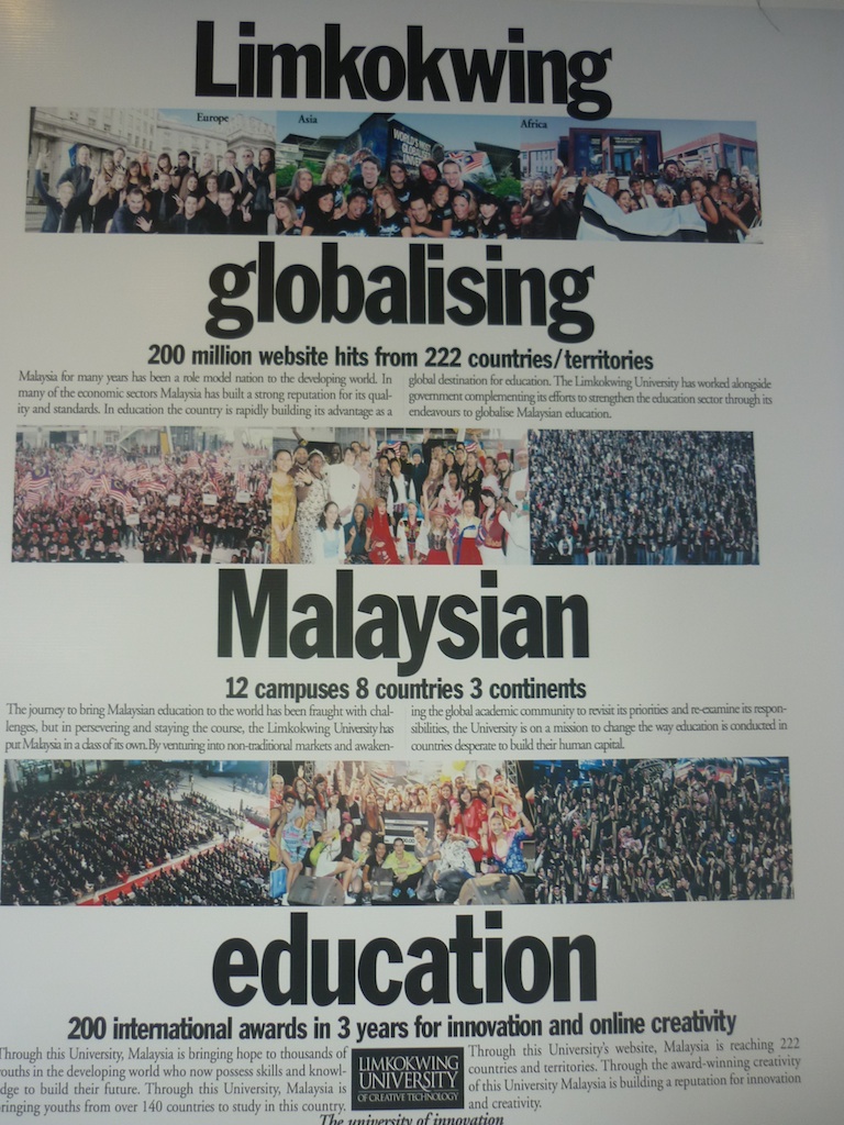 Malaysia has developed a market for private higher education in the past few decades. Education turned into a commercial product, which is advertised by the universities’ marketing departments and offered internationally. On a hot and hazy afternoon, Sandra and I drove to Cyberjaya, a satellite town in the Klang Valley in the periphery of Kuala Lumpur, planned as the Malaysian Silicon Valley. There is the main campus of Limkokwing University, a pioneering institution that sticks out with its rather aggressive marketing strategy. As visitors, we got the impression that the whole idea behind this university is a big image campaign. The university opened up branch campuses around the world, not only in Southeast Asia but also in Africa and the Middle East.